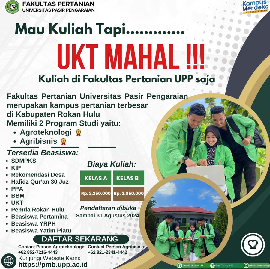 “Kuliah di Fakultas Pertanian merupakan pilihan yang tepat. Karena Fakultas Pertanian UPP ini merupakan Fakultas Pertanian terbesar di Kabupaten Rokan Hulu,” terangnya.