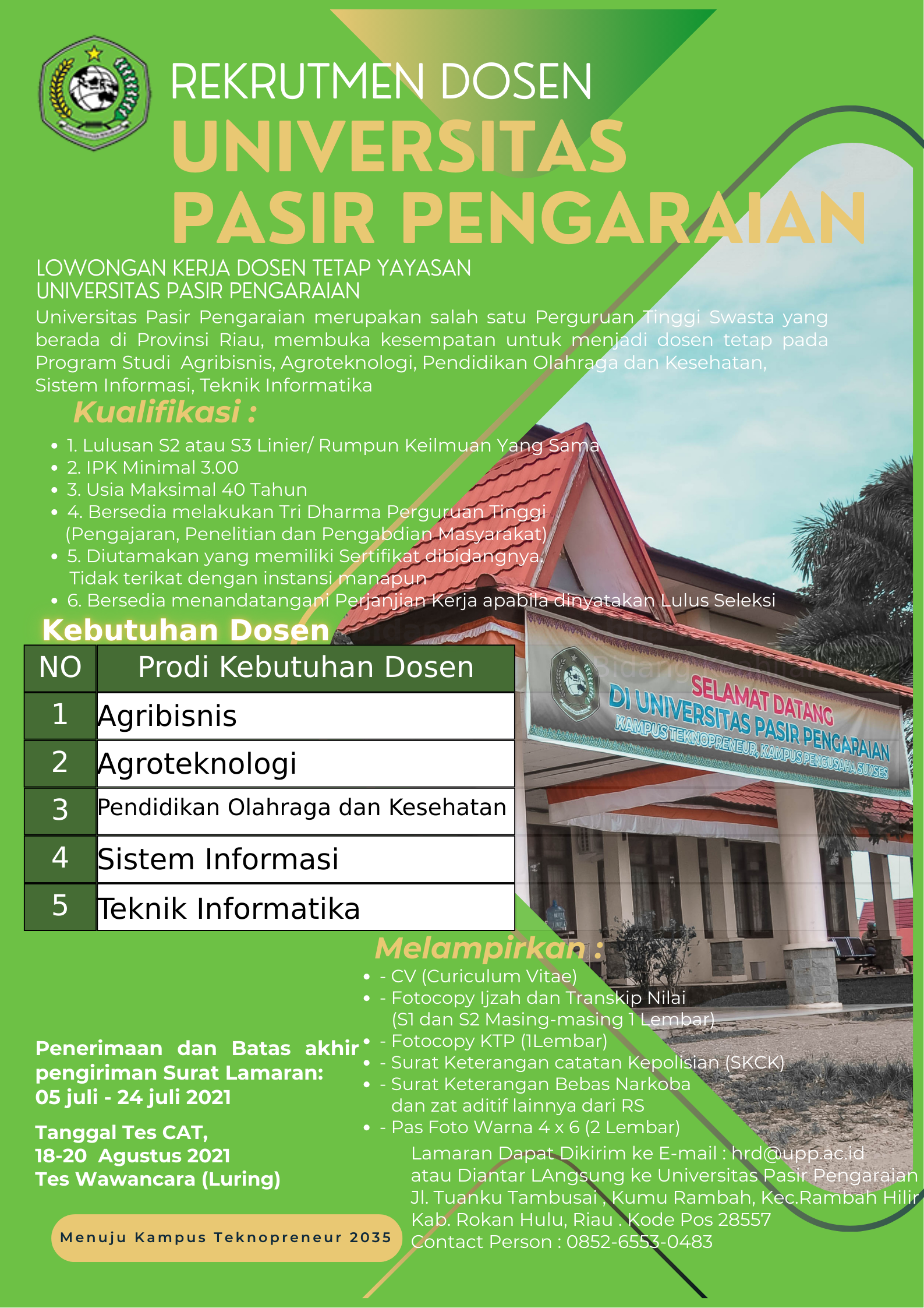 Universitas Pasir Pengaraian - Kampus Teknopreneur 2035, merupakan perguruan tinggi swasta yang terus berkembang secara pesat. Hal ini terbukti dengan dibukanya kembali penerimaan dosen tetap untuk beberapa Program Studi. Berikut bidang dan keahlian Dosen yang dibutuhkan :