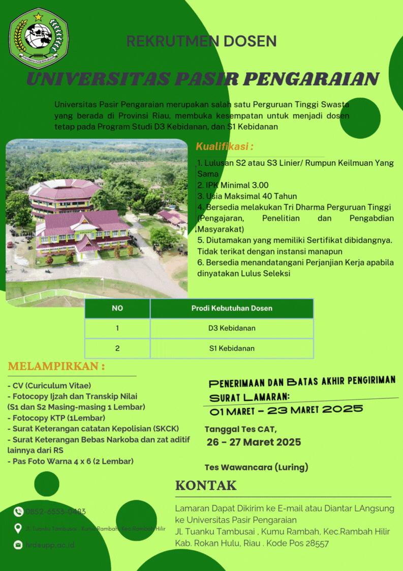 Universitas Pasir Pengaraian - Kampus Teknopreneur 2035, merupakan perguruan tinggi swasta yang terus berkembang secara pesat. Hal ini terbukti dengan dibukanya kembali penerimaan dosen tetap untuk beberapa Program Studi. Berikut bidang dan keahlian Dosen yang dibutuhkan :