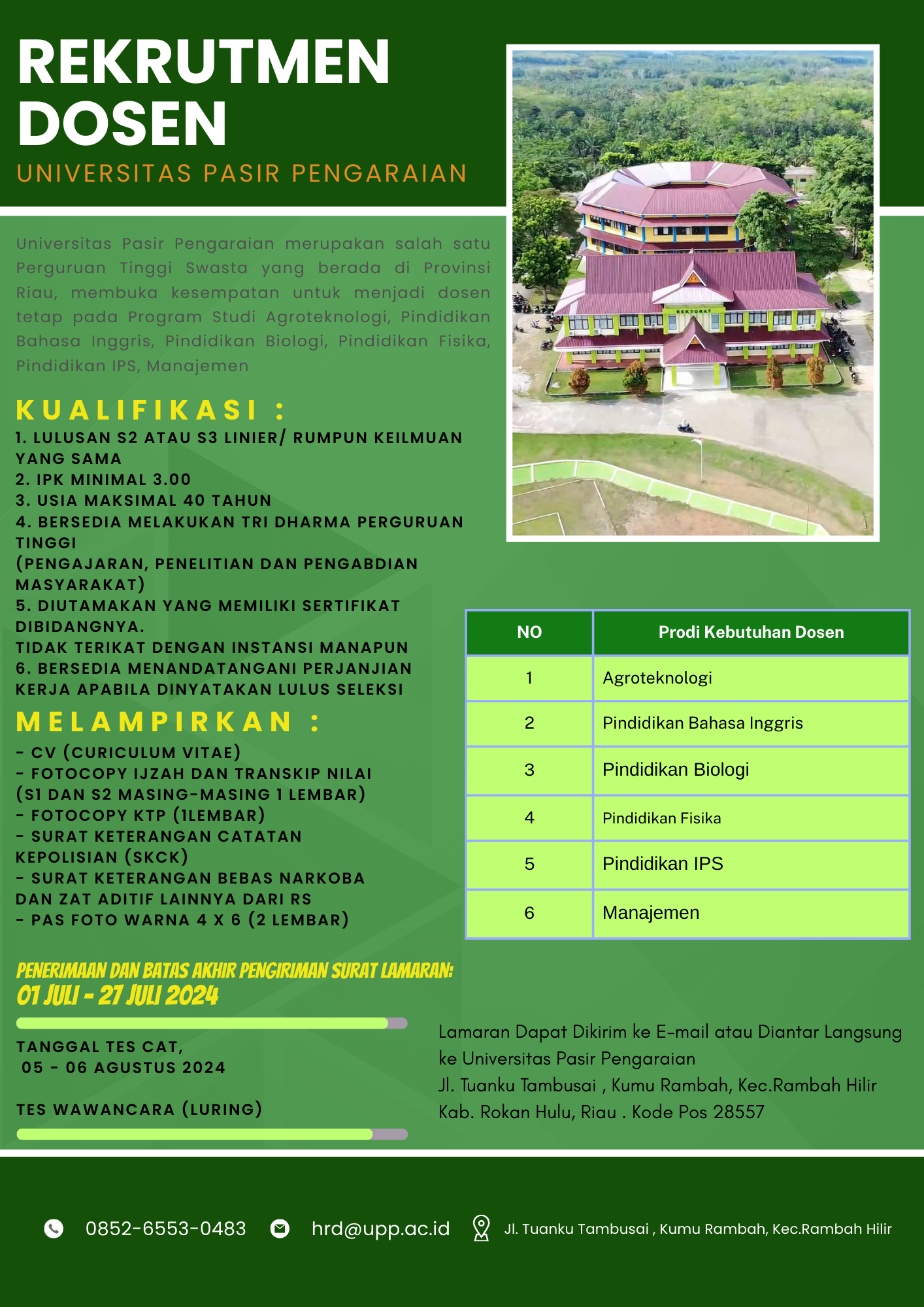 Universitas Pasir Pengaraian - Kampus Teknopreneur 2035, merupakan perguruan tinggi swasta yang terus berkembang secara pesat. Hal ini terbukti dengan dibukanya kembali penerimaan dosen tetap untuk beberapa Program Studi. Berikut bidang dan keahlian Dosen yang dibutuhkan :