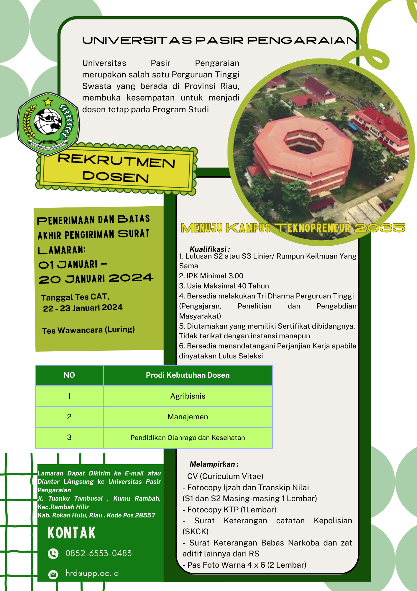 Universitas Pasir Pengaraian - Kampus Teknopreneur 2035, merupakan perguruan tinggi swasta yang terus berkembang secara pesat. Hal ini terbukti dengan dibukanya kembali penerimaan dosen tetap untuk beberapa Program Studi. Berikut bidang dan keahlian Dosen yang dibutuhkan :